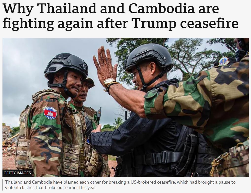 ထိုင္း-ကေမာၻဒီးယား နယ္စပ္တစ္ေလွ်ာက္မွာ အေျမာက္ႀကီးမ်ား၊ ေရာ့ကတ္မ်ားနဲ႔ ေလေၾကာင္းတိုက္ခိုက္မႈ မ်ား ထပ္မံျဖစ္ေပၚေနပါတယ္။ မိုင္ ၅၀၀ ေက်ာ္ရွည္လ်ားတဲ့ နယ္စပ္တေလ်ာက္ရွိ ေက်း႐ြာမ်ားကို ၅-လအတြင္း ဒုတိယေျမာက္အျဖစ္ ေဘးလြတ္ရာေ႐ႊ႕ေျပာင္းေပးေနၾကပါတယ္။ မိသားစုမ်ားနဲ႔သူတို႔ရဲ႕ အိမ္ေမြးတိရစာၦန္ ေတြဟာ ယာယီတဲမ်ားရွိ ဖ်ာမ်ားေပၚမွာ ထိုင္ၾကရင္း ဘယ္အခ်ိန္ အိမ္ျပန္ႏိုင္မယ္ဆိုတာနဲ႔ ဘယ္အခ်ိန္ ထပ္မံ ထြက္ေျပးရမယ္ဆိုတာကို ေတြးေတာေနၾကေၾကာင္း၊ ၿပီးခဲ့တဲ့ ဇူလိုင္လ အေမရိကန္သမၼတေဒၚနယ္ထရမ့္ ၾကား ဝင္ေစ့စပ္ေပးခဲ့လို႔ အပစ္အခတ္ရပ္စဲၾကၿပီးေနာက္ ဘာမွမၾကာခင္ ဘာ့ေၾကာင့္ ခုလို ျဖစ္ရပါသလဲလို႔ BBC(11 December 2025) က ေမးခြန္းထုတ္လိုက္ပါတယ္။